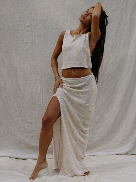 This two piece set embraces minimalist vibes. Wear it layered over swimwear in tropical climates or styled for a night out if your comfortable with its lightweight, subtly sheer nature. Woven from a cotton acrylic blend that has beautiful texture.